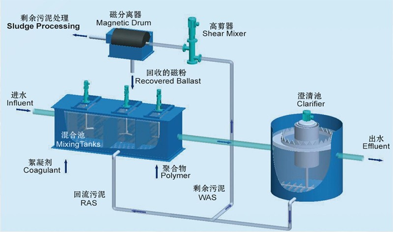 磁混凝沉淀技术就是在传统的混凝沉淀工艺中同步加入比重为4.8-5.1的磁粉,使之与污染物絮凝结合成一体,以加强混凝、絮凝的效果,使生成的絮体密度更大、更结实,从而达到高速沉降的目的。磁絮团的沉降速度可高达40 m/h以上。磁粉则通过高剪切机和磁种捕捉器(磁分离机)回收循环使用。